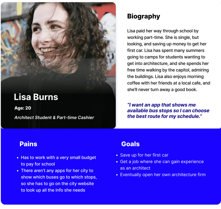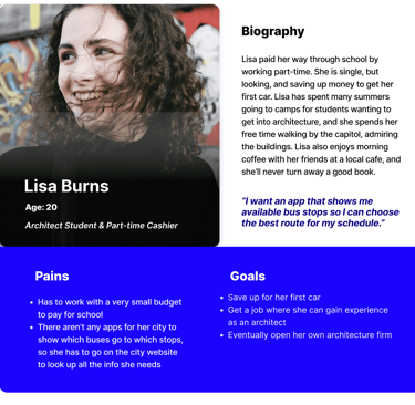 Based on my research, I created a user persona of a young woman who recently graduated college to help me picture the kind of app she would prefer.