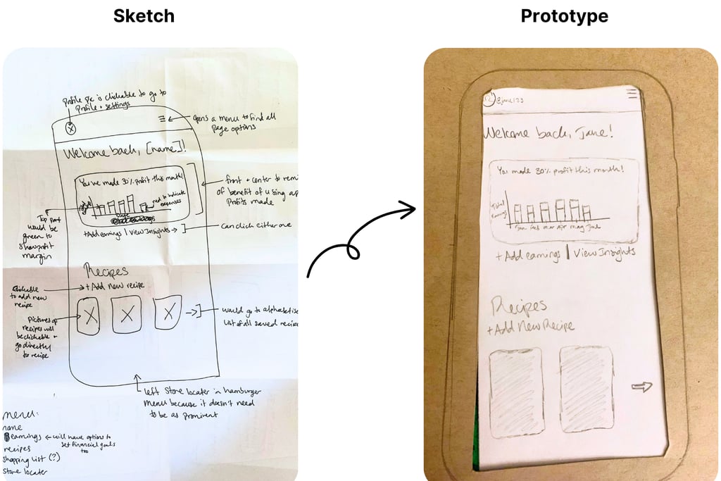 For the home screen, I wanted to highlight two key components: profits and recipes.