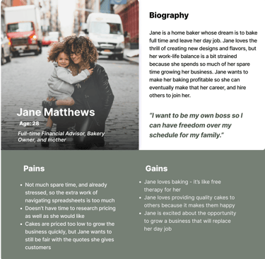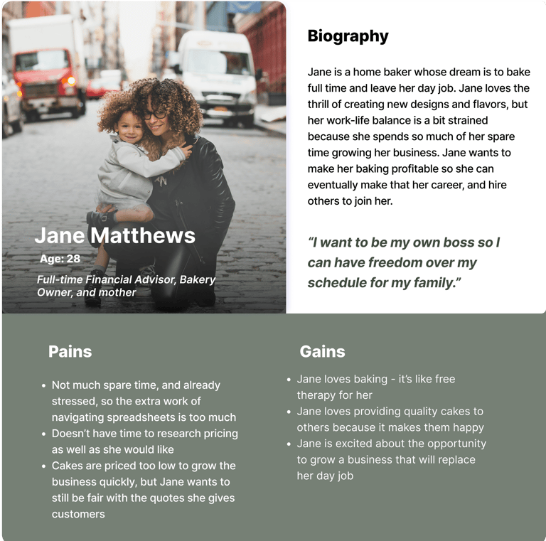 Before getting to any sketches, I started by putting together a user persona named Jane. Jane's profile was based on the research I gathered previously when reviewing various home bakers on social media.
