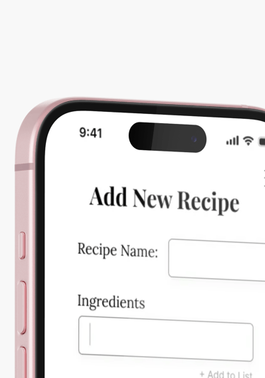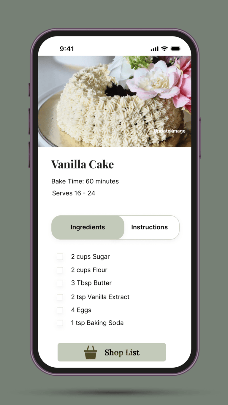 I also added recipes right below because of the importance they play in the pricing strategy. Bakers must use the price of their ingredients as the base from which they build their pricing structure for their items. By adding a recipe section, users can add and edit recipes, then convert that into a shopping list or the base for their prices.